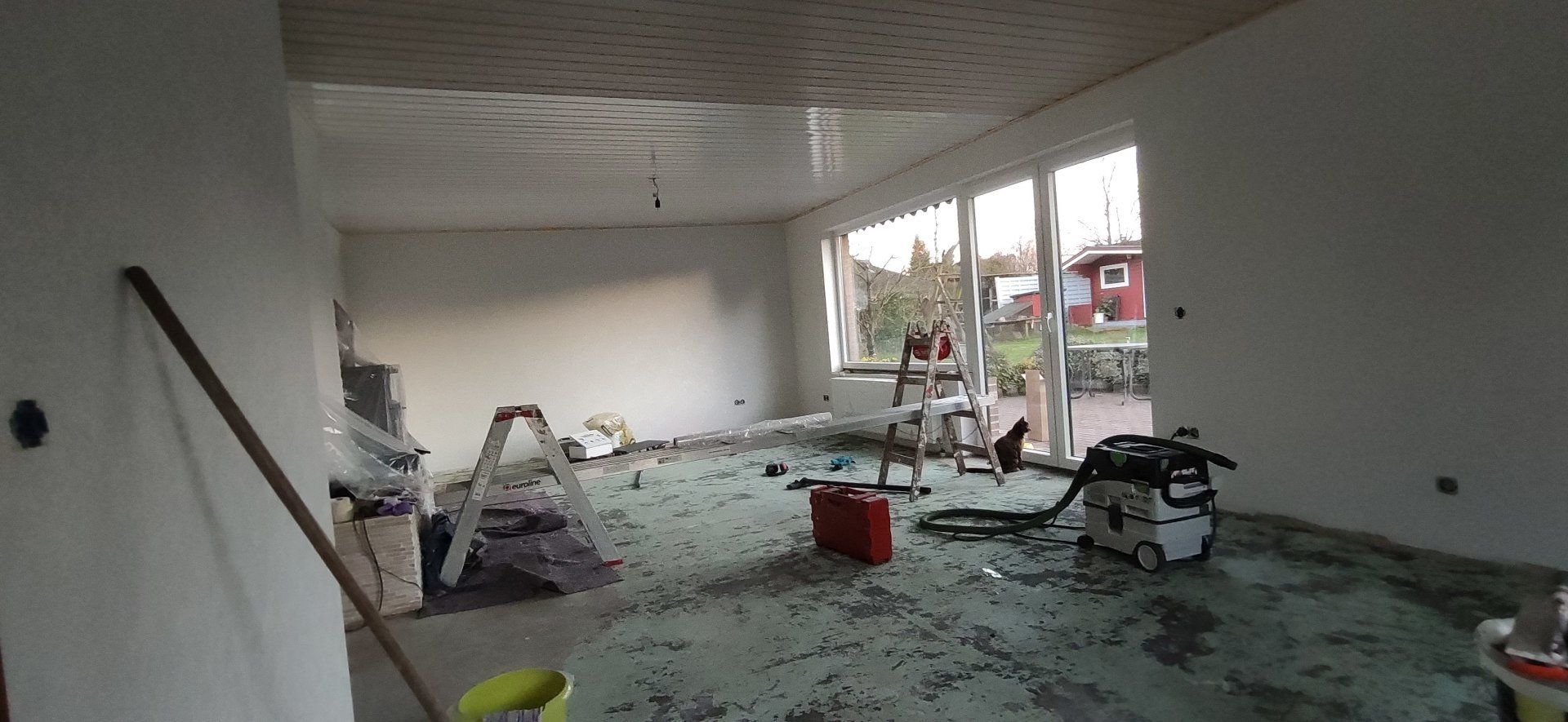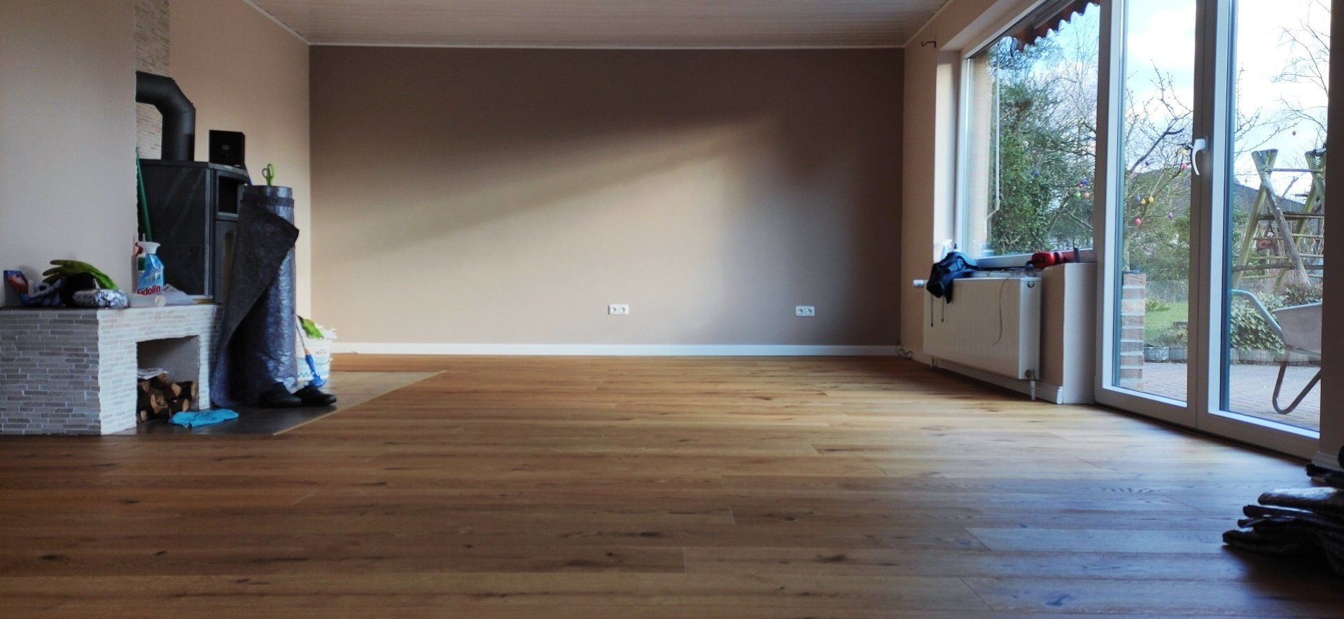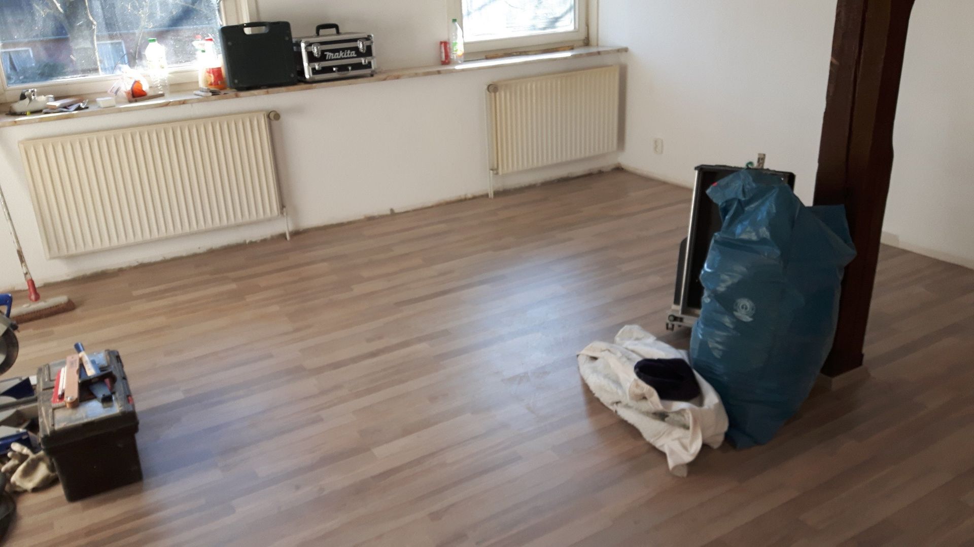 Wände wurden mit einer Dispersionsfarbe abgesetzt. Für den Boden wurde ein Fertig Parkett ausgewählt und verlegt.
